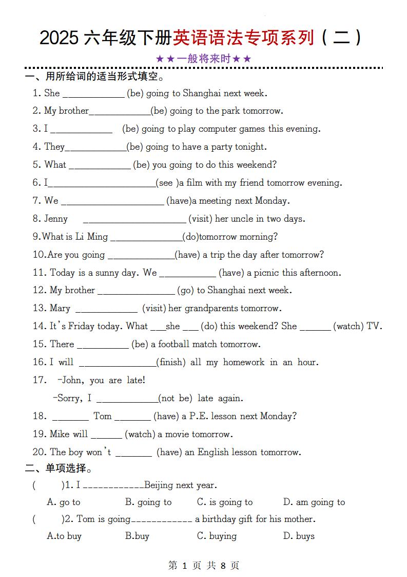 【2-24】【英语】2025六年级下册英语语法专项系列(二)★★一般将来时★★