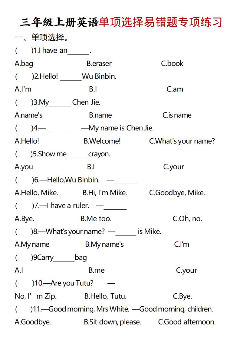 三年级上册英语单项选择易错题专项练习题-大设天下