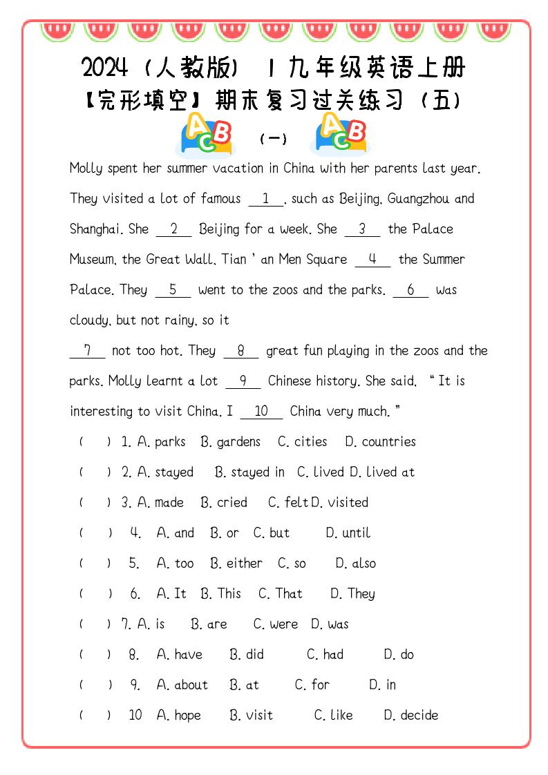 【2025秋新版】九年级英语上册:完形填空期末复习过关练习(5篇)-大设天下